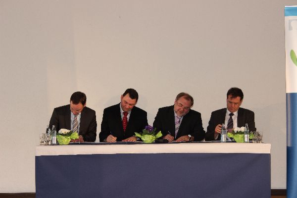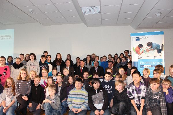 Die Unterzeichnung der Kooperationsvereinbarung geschah am Mittwoch, den 15. Februar im Rahmen einer Feierstunde in der Aula. Viele Gäste aus Schule und Wirtschaft kamen und wurden von Herrn Flaschel begrüßt. Die Schulband spielte zur großen Freude aller Zuhörer und bekam viel Lob von den Rednern. Unsere Schülersprecher Katharina Golz und Alexander Ackfeld betonten in ihrer Rede die besonders gute Berufswahlvorbereitung der Schule und Herr Husemann von der Bezirksregierung lobte den Schritt von der „lockeren Verzahnung zur festen Bindung“ an das Wirtschaftsunternehmen. Die Industrie und Handelskammer unterstützt das Projekt ebenfalls. Herr Binner von der IHK sagte, dass die Kooperation Schulen zukunftsfähiger macht und die Wettbewerbsfähigkeit der Unternehmen durch qualifizierteres Personal stärkt. Die Unterzeichnung des Vertrages bietet beiden Seiten viele Möglichkeiten. So betonte der Vorstandssprecher der Westag & Getalit AG Bernhard Wenninger, dass er Schüler und auch Lehrer näher an die Westag heranführen möchte, um ihnen einen besseren Einblick in die Berufswelt und einen besseren Überblick über berufliche Möglichkeiten zu geben. Dabei lobte er das überdurchschnittliche Niveau unserer Schule im Bereich der Mathematik und Naturwissenschaften und hob „die hervorragende Arbeit, die an der ORS bislang geleistet wird und hoffentlich noch lange geleistet werden kann“ besonders hervor. Der Bürgermeister, Theo Mettenborg, lobte ebenfalls die Kooperationsvereinbarung: „Als Stadt Rheda-Wiedenbrück freuen wir uns über diese Kooperation zwischen Osterrath-Realschule und Westag & Getalit AG. Es ist für Schüler und spätere Ausbilder der beste Weg sich kennenzulernen. Dies ist ein zukunftweisender Weg für alle Schüler.“ Ralf Harz, Schulpflegschaftsvorsitzender, sprach stolz von einer Kooperation zwischen einem starken Unternehmen und einer starken Schule. Nach der Unterzeichnung wurden die Gäste von der Hauswirtschaftsgruppe mit einem tollen kalten Buffet verwöhnt.