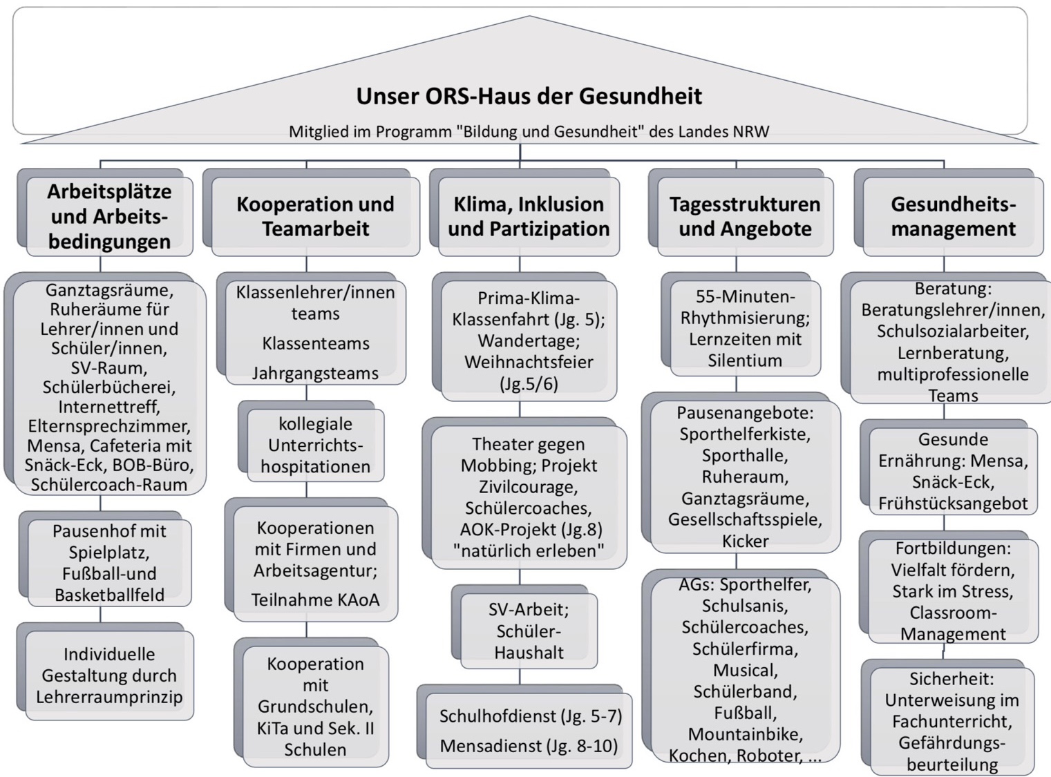 Als langjährige Mitgliedsschule im Landesprogramm Bildung und Gesundheit des Landes NRW hat sich die ORS den Prinzipien einer guten gesunden Schule verpflichtet. Dabei wird Gesundheit gemäß der Definition der Weltgesundheitsorganisation (WHO) verstanden, also nicht nur als Abwesenheit von Krankheit, sondern als „Zustand vollkommenen körperlichen, geistigen und sozialen Wohlbefindens“. Entsprechend berührt dieser Gesundheitsbegriff alle Qualitätsbereiche von Schule: Lebensraum, Unterricht, Lernen, Schulklima, Schulführung, Personalentwicklung, Qualitätsmanagement, Wirkungen (vgl. IQES-Qualitätstableau; IQES = Instrumente für Qualitätsentwicklung und Evaluation an Schule).