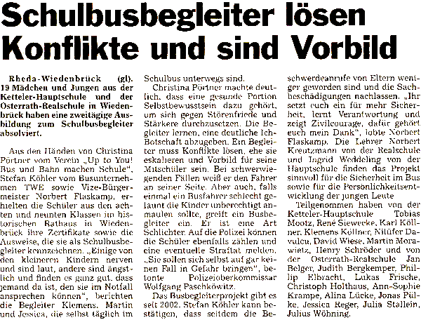 Rheda-Wiedenbrück (gl). 19 Mädchen und Jungen aus der Ketteler-Hauptschule und der Osterrath-Realschule in Wiedenbrück haben eine zweitägige Ausbildung zum Schulbusbegleiter absolviert.