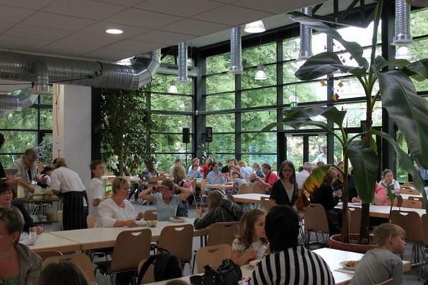 Außer den Ganztagsräumen ist die Mensa das neue Prunkstück der Osterrath-Realschule. Pfarrer Marco Beuermann von der Evangelischen Versöhnungs-Kirchengemeinde und Pastor Michael Melcher von der St.-Aegidius-Gemeinde gaben dem Speisesaal ihren Segen. Schüler können dort täglich zwischen zwei Mahlzeiten wählen – und Nudeln gibt es so viel wie jeder essen kann.