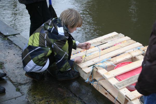 Dazu gibt es die Survival AG. Werden im fünften und sechsten Schuljahr zunächst Grundfertigkeiten geübt, wie etwa in Erster Hilfe für Kinder, einigen Improvisationstechniken oder dem Feuermachen, so wird es im siebten und achten Schuljahr schon anspruchsvoller. Für die Großen galt es mit Hilfe eines selbst gebauten Floßes die Ems zu überqueren. Das Floß durfte nur aus kostenlosem Baumaterial hergestellt werden, was die Sache anspruchsvoller machte. Mitte Dezember war es dann soweit: Das Floß musste beweisen, was es konnte. Ein mutiger Testpilot war schnell gefunden. Wie das Ganze aussah könnt ihr auf den Fotos sehen.