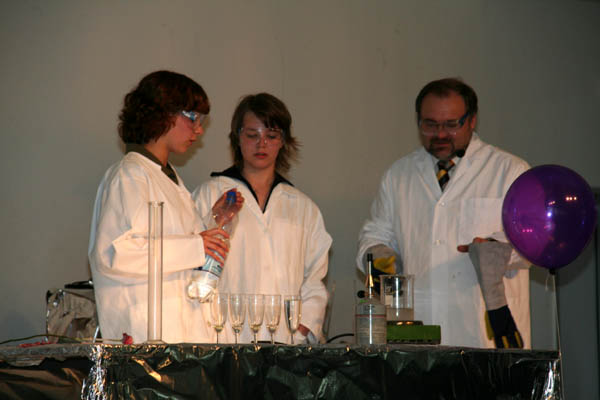 Nach einer kurzen Begrüßung durch unseren Moderator Herrn Wiertz, der durch das Showprogramm führte, begrüßte unser Schuldirektor Herr Flaschel die anwesenden Gäste. Herr Greufe von der Stadt Rheda-Wiedenbrück hielt eine kurze Eröffnungsrede, bevor Herr Flaschel mit seiner 20-minütigen Show "Zauberhafte Chemie" das Publikum begeisterte. Er zeigte uns, wie man aus Kupfer Silbermünzen und Goldmünzen herstellen kann, dass Rosen, die man in flüssigen Stickstoff hält, in tausend Teile zerspringen wenn sie zu Boden fallen, dass die Herstellung von Bier aus dem Emswasser kinderleicht ist und Gummibärchen in erhitztem Zucker zu sprühen anfangen (auch wenn dieser Versuch nicht so ganz geklappt hat).
