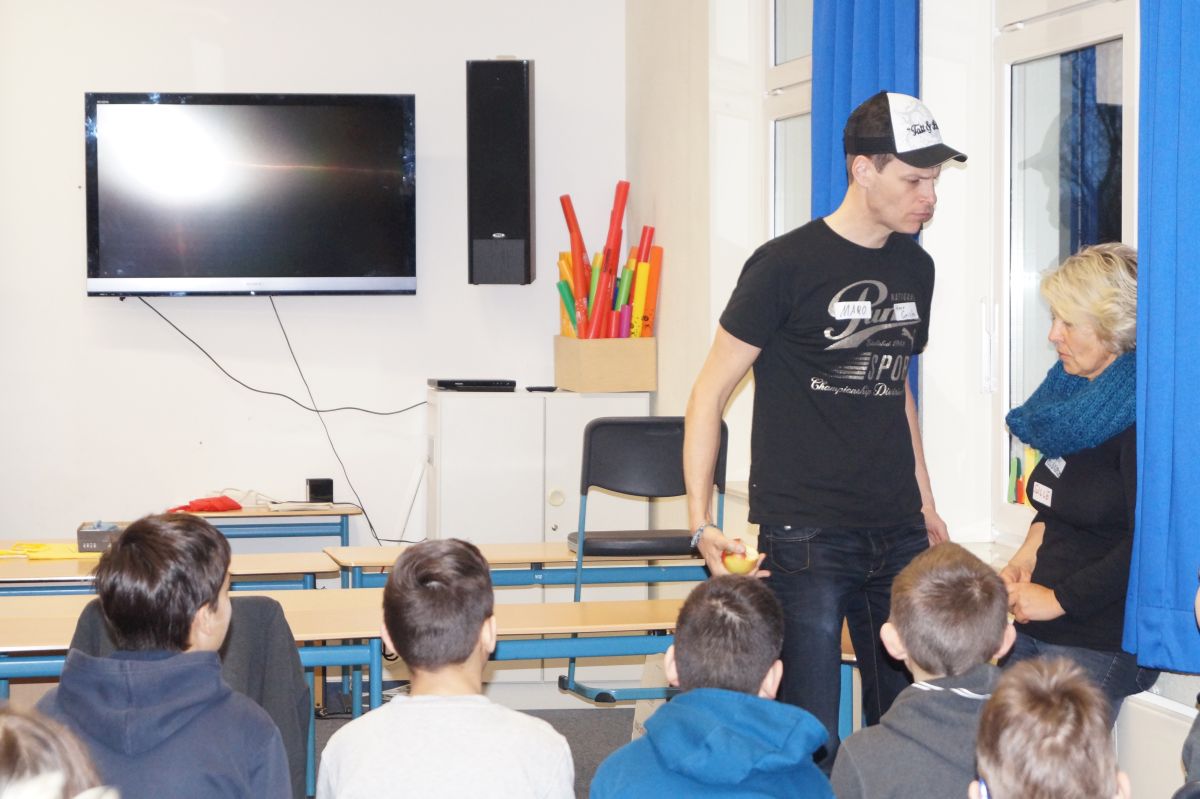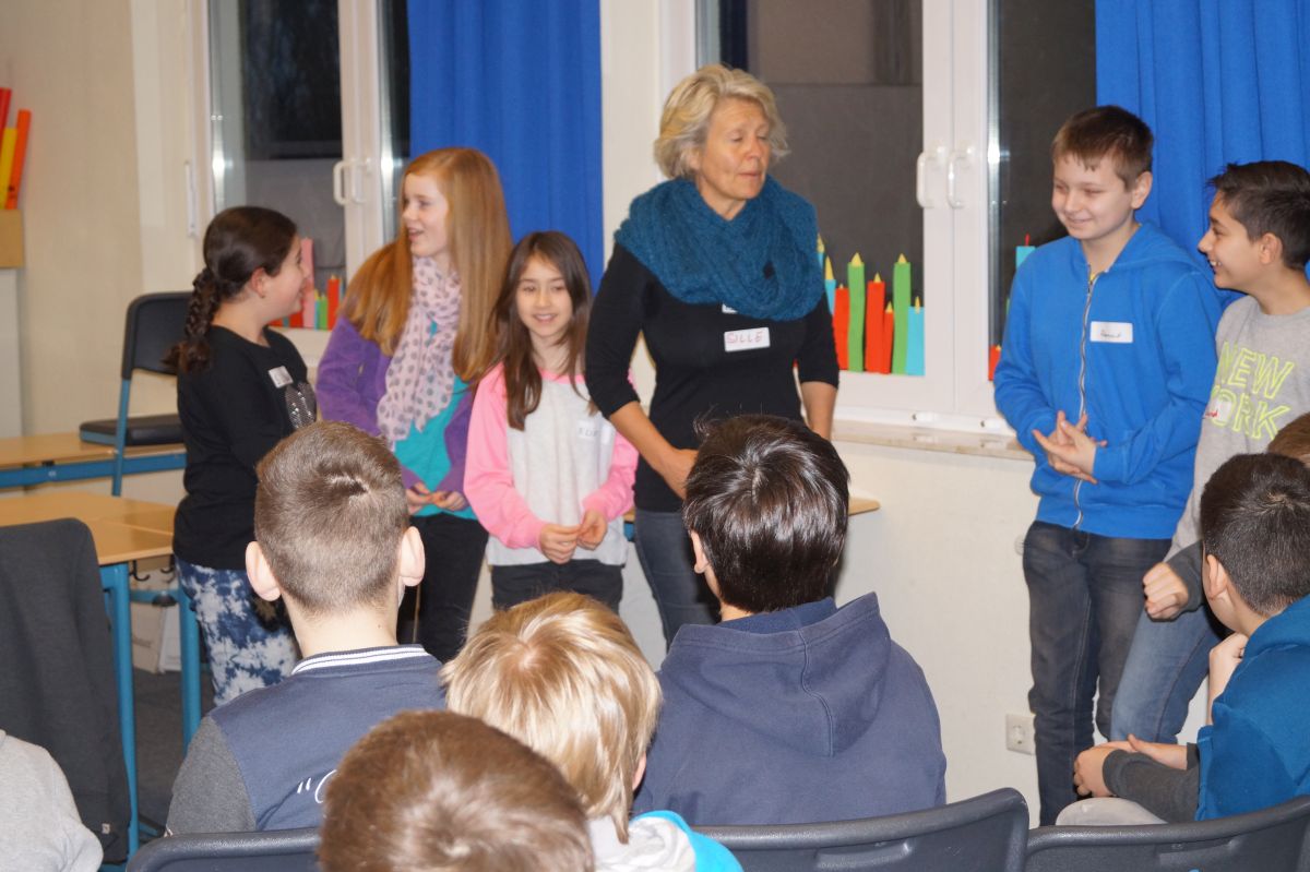 Hoch her ging es in den Klassen 5a, 5b und 5c, als sie im Rollenspiel mit den Zivilcourage-Trainern Sibylle Rosenberger und Lars Geisler ausprobieren durften, wie man der fiktiven Mitschülerin Sille (Sibylle Rosenberger) helfen kann, die von dem älteren Schüler Maro (Lars Geisler) erpresst wird. “Den Schülern wird sehr realistisch und altersgerecht vor Augen geführt, wie wichtig es ist, dass Mitschüler in solchen Konfliktsituationen nicht wegesehen, sondern Courage zeigen und die hilfebedürftige Person schützen“, beschreibt Sibylle Rosenberger den Hintergrund des interaktiven Theaterstückes. Lars Geisler: „Die Kinder durften auch ausprobieren, wie eine Situation eskaliert, wenn sie versuchen, über gewaltvolle Aktivitäten den Täter einzudämmen. Sie konnten direkt miterleben, wie eine „Gewaltspirale“ in Gang gesetzt wurde und es war allen schnell klar, dass das keine Lösung sein kann.“