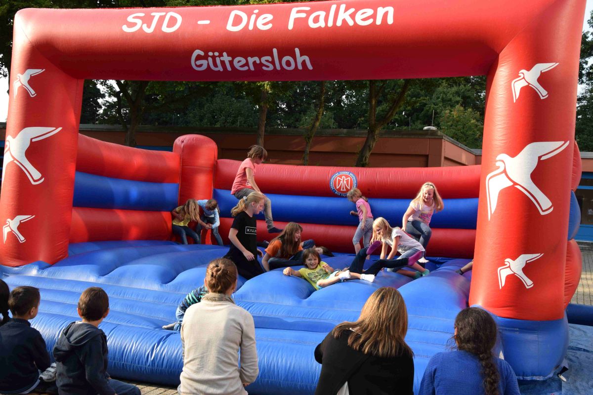 Für Spiel und Spaß sorgte das Spielmobil der „Falken Gütersloh“, die neben einer großen Hüpfburg viele Bewegungsspiele, Malangebote und auch eine Buttonmaschine im Gepäck hatten. Die Sporthelfer der Schule organisierten Fußball- und Basketballspiele, so dass alle Kinder auf ihre Kosten kamen. Der Vorsitzende des Fördervereins, Andreas Heimann, begrüßte alle Gäste der Klassen 5 und 6 und gab seiner Freude Ausdruck, dass so viele der Einladung gefolgt waren, „Mit einem solchen Zuspruch haben wir nicht gerechnet, aber wir freuen uns riesig, dass sie mit uns gemeinsam den Neustart ihrer Kinder feiern