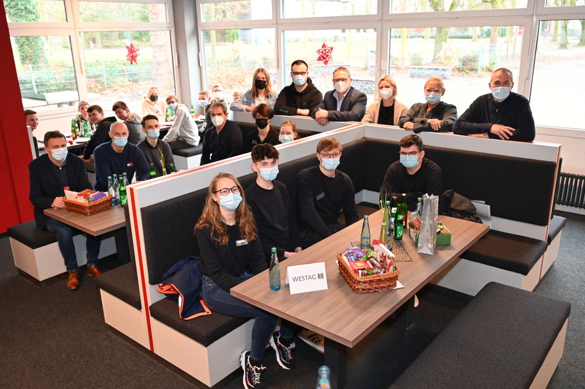 Eingeladen waren neben zahlreichen an der Umsetzung beteiligten Schülerinnen und Schülern die Vertreter der drei Betriebe. Ausbildungsleiter Norbert Stiens von der Westag, Geschäftsführer Christian Nüsser und Ausbildungsleiter Jan Ventur von Venjakob Maschinenbau sowie Frau Susanne Schlenke von der Firma COR waren mit ihren Auszubildenden gekommen, die die Schülerinnen und Schüler angeleitet, unterstützt und das Projekt zum erfolgreichen Abschluss gebracht haben.