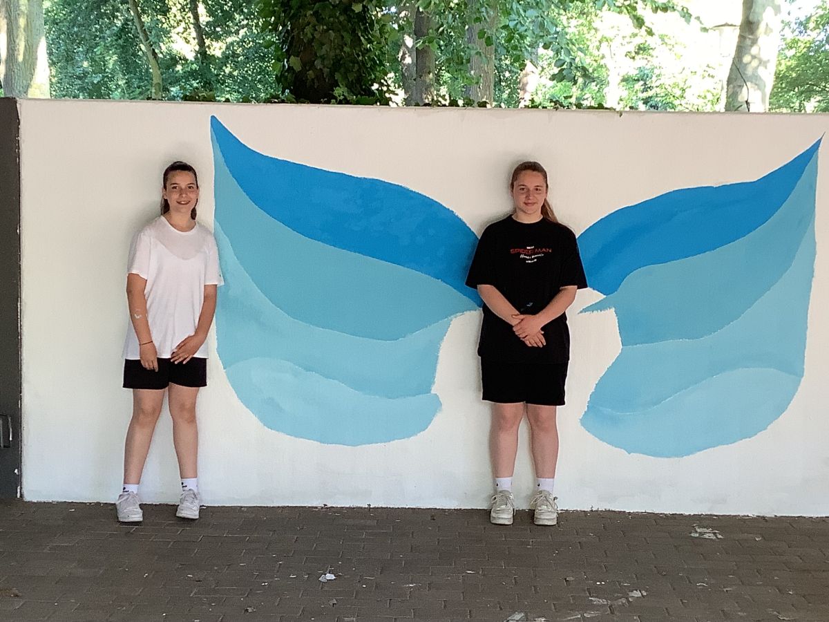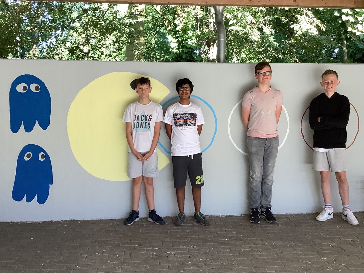 Der 1. Wandabschnitt verdeutlicht nun besser die Parkmöglichkeiten für Roller, Mofas und Mopeds an unserer Schule, das zweite Bild, zeigt Engelsflügel, der dritte Abschnitt die King Figur aus einem Handyspiel. Der folgende Wandabschnitt stellt Pac Man mit den ORS Buchstaben dar. Den mittleren Teil der Fahrradständer haben wir dafür genutzt, um die Begrüßungs- und Verabschiedungsformeln in verschiedenen Sprachen anzuschreiben, dies soll verdeutlichen, dass wir alle Nationalitäten an unserer Schule herzlich willkommen heißen. Den letzten Abschnitt, die blauen Figuren haben wir erneuert und ausgebessert.