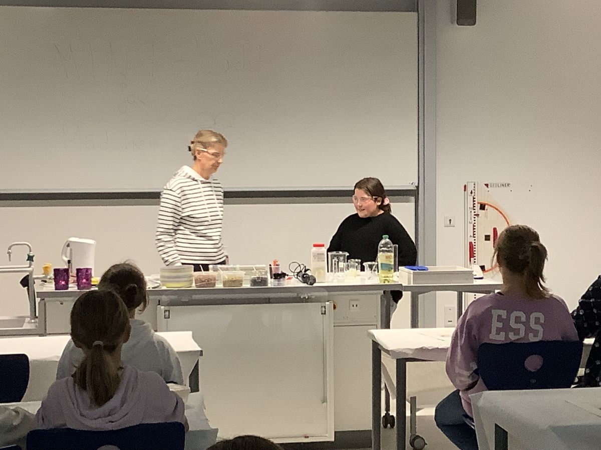 In der Woche vor den Herbstferien nahmen daher 20 Mädchen aus den Jahrgängen 6-9 an der ersten MINT-Mädchen-Nacht teil. Bevor es allerdings so richtig losging, zeigte Frau Schorr zunächst experimentell, wie Seife hergestellt wird. Als Ersatz für diese Rohseife, die nach der Herstellung erst einmal mehrere Tage trocknen muss, bekamen die Mädchen fertige Kernseifen. Diese wurden eifrig gerieben und geraspelt, bis feine Seifenflocken entstanden. Danach durfte nach eigenem Belieben mit Lebensmittelfarbe und Düften von Bratapfel, Lavendel und Vanille geknetet und mit Händen oder Ausstechern geformt werden. Zum Schluss veredelten die Mädchen ihre Seifen mit Blüten von Kamille, Lavendel oder Teeblättern. Der Abend machte nicht nur den Teilnehmerinnen viel Spaß, auch Frau Michaelis und Frau Dittrich-Borgmeier als weitere MINT-Lehrerinnen freuten sich über den Einsatz und das Interesse an dieser gelungenen MINT-Nacht für Mädchen. Eine Wiederholung ist daher fest eingeplant.